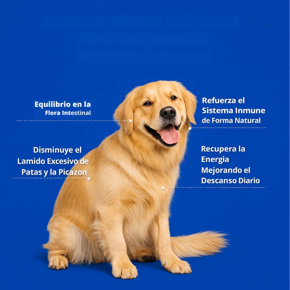 Ayuda a equilibrar la flora intestinal de tu perrito, reduciendo problemas como diarrea ocasional, gases, lamido excesivo de patas, picazón, malestar estomacal y baja energía. También refuerza el sistema inmune de manera natural.